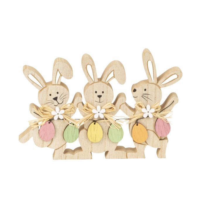 Tre glada påskharar snidade i trä med små bastrosetter, blommor och liten girlang med färgade ägg. De leende och dansande påskhararna lyfter vårstämningen.
