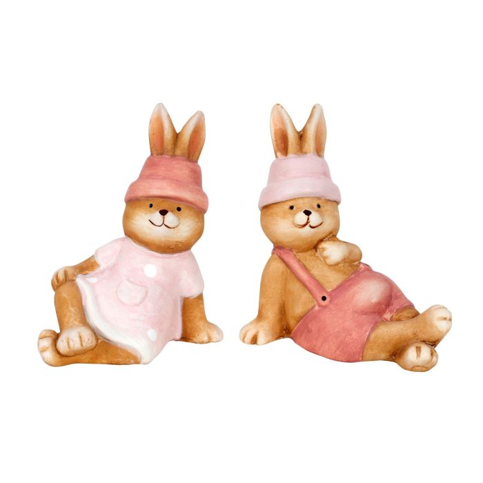 Påskhare med rosa kläder liggande. Påskharen följer med pastellfärgade trenden och har klätt sig i rosa kläder och hattar. Det doftar nästan sommar. Påskharen är 11 cm hög och 10,5 cm lång. Tillverkad av keramik.