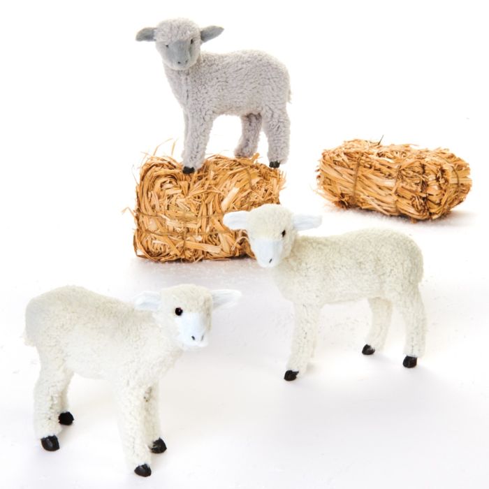 Söta, mjuka naturtrogna påsklamm i färgerna grått eller vitt. Påsklammen har plyschpäls och svarta hovar.