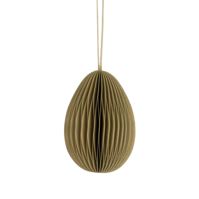 Litet påskägg i olivgrönt papper. Påskägget är tillverkat av återvunnet papper. Ägget vecklas ut och stängs med en liten magnet. Mäter 7 cm i höjd.