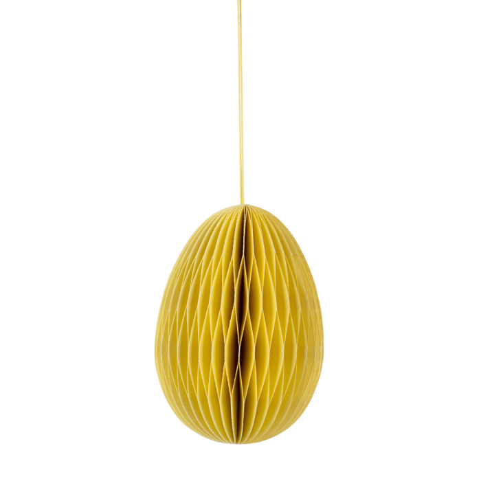 Påskägg i påskgul papper. Påskägget är tillverkad av återvunnet papper. Ägget vecklas ut och stängs med en liten magnet. Påskägget finns i många vackra färger och i tre storlekar. Dekorerar vackert i fönster eller på vårens grenar.