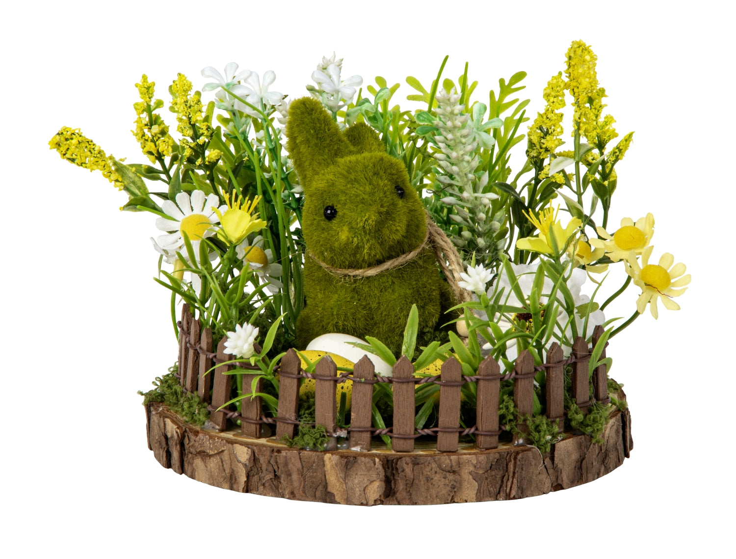 Den mossgröna påskharen är omgiven av konstgjorda blommor i påskens ljusa och glada färger, vilket ger liv och vårkänsla åt arrangemanget. Det lilla staketet skapar en mysig ram runt dekorationen och ger intrycket av en miniatyrträdgård där påskharen håller koll på sina ägg. Kombinationen av naturinspirerade material och färgglada detaljer gör dekorationen lämplig som dekoration på påskbordet, i fönsterbrädan eller på en hylla.