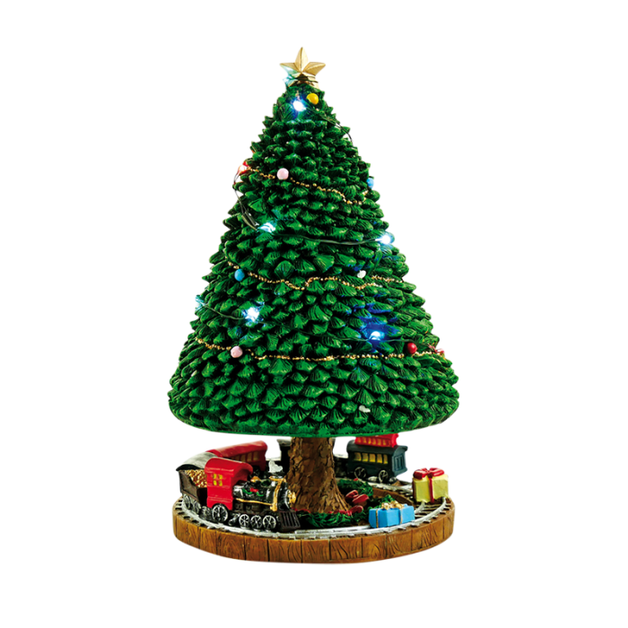 Tät, bred julgran med enkel girlang och färgade LED-lampor. Julgranen står upprätt och runt stammen finns ett litet tåg och paket på skenorna. Speldosa kan dras upp och julgranen snurrar runt till melodin: "O Christmas Tree".
