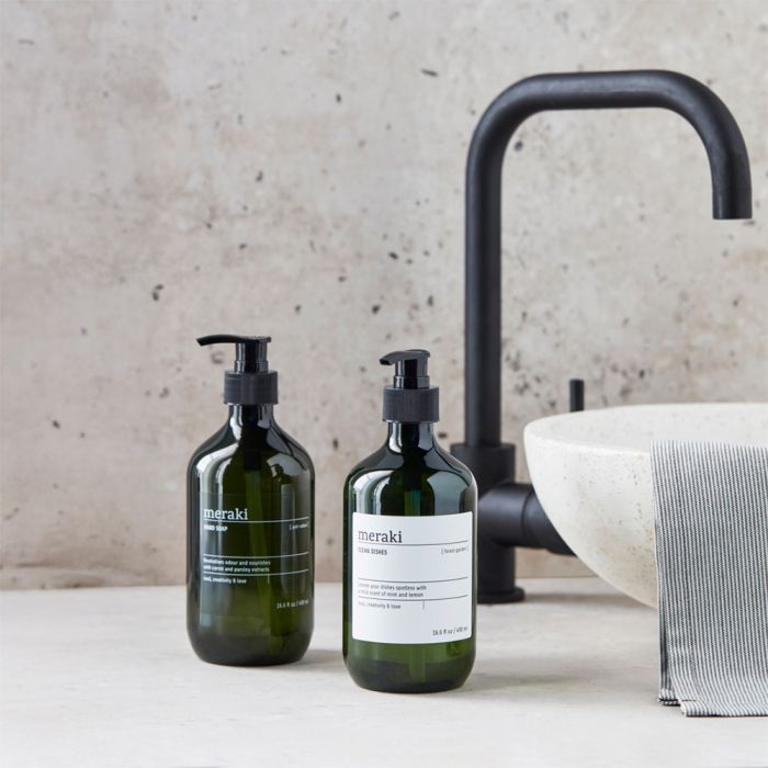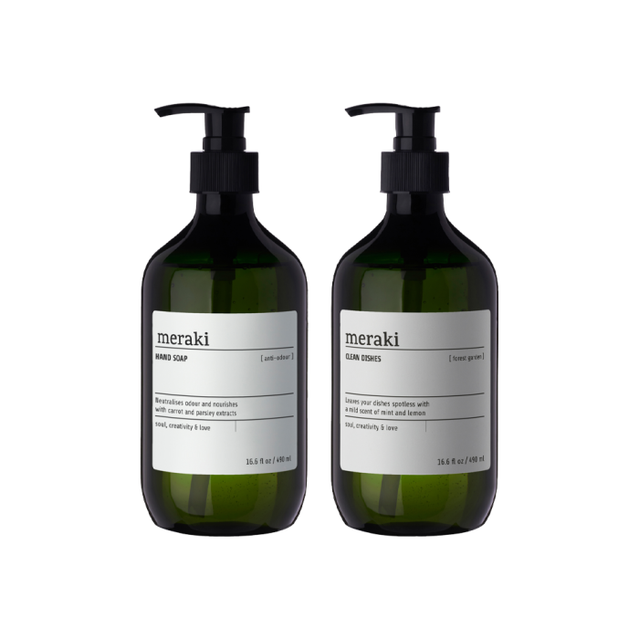 Det här gåvosetet från Meraki innehåller två oumbärliga produkter för köket, båda i gröna pumpflaskor med 490 ml. Handtvålen är utvecklad för att neutralisera matos och lämnar händerna med en ren och lätt mintblommig ton. Betain hjälper till att hålla huden mjuk och stärker hudbarriären vid frekvent handtvätt. Diskmedlet Forest Garden är Svanenmärkt och har en frisk doft, där mint och citron skapar en ren och uppiggande känsla under diskningen. Setet förenar funktion och välbefinnande i ett stilrent helhetsintryck och levereras i en vacker presentförpackning, vilket gör det till en fin värdinnegåva, inflyttningspresent eller omtänksam hälsning i vardagen.