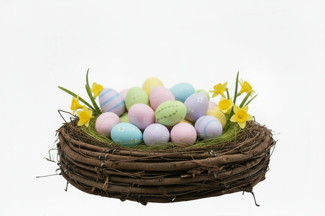 Skapa en riktig vårstämning med en rustik kruka gjord av flätade mullbärsgrenar. Den naturliga strukturen och den varma bruna färgen ger ett organiskt och mysigt utseende, perfekt för påskdekorationer och vårarrangemang.