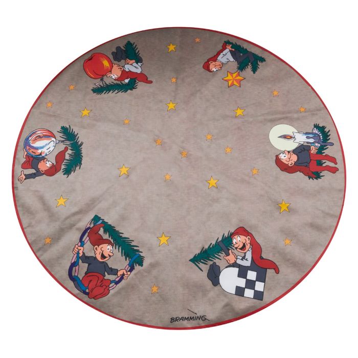 Låt julstämningen flytta in med detta klassiska juleträdsfilt från Pobra, en älskad modell som i många år har spridit värme i nordiska hem. Den mjuka grå botten ramas in av ett rött kantband, och runt hela filten sitter eller hänger sex charmiga Brammingnissar med julgranskvistar och pynt medan små gula stjärnor lyser upp som decemberglitter. Här möts tradition, humor och den välkända Brammingstilen som generationer har haft kær. Med en diameter på 135 cm passar filten perfekt under större julgranar och ger ett harmoniskt uttryck till hela rummet.