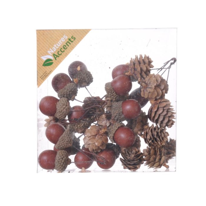 Dekorativa bruna ekollon och kottar för kreativa dekorationer. Setet består av konstgjorda nötter med äkta ekollonhattar samt små bruna kottar. Ekollonen är försedda med ståltråd, vilket gör dem enkla att fästa i kransar, dekorationer och arrangemang. Perfekta för både jul, vinter och höst, där de tillför en naturlig känsla. Förpackningen innehåller ca 14 ekollon med ståltråd och 14 små kottar.