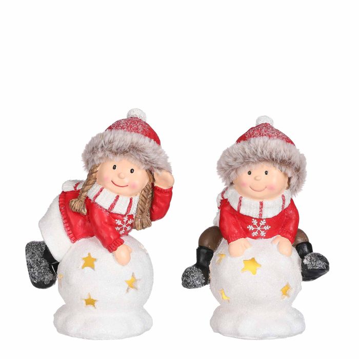 Pojke och flicka med snöboll. Söt figur av ett barn i röd tröja med snöflingor och matchande halsduk och tomteluva. Det är ljus i snöbollen. Figuren finns i 2 varianter: flicka och pojke.