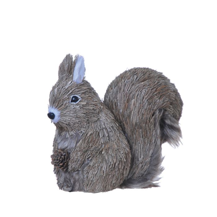 Ekorre med kotte. Hösten har kommit, och den lilla ekorren har hittat en kotte. Ekorren är 22 cm hög. Tillverkad av frigolit, gräs och konstpäls.