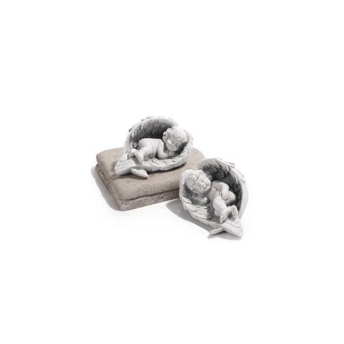 Änglar som sover i änglavingar. Änglarna är i vitt polyresin. Mäter 5 cm i längd. Finns i 2 varianter.