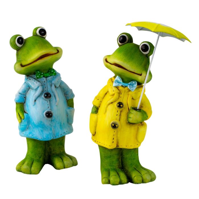 Rolig groda med regnkappa och fluga i färgerna gult eller blått. Grodan med en gul regnrock har ett paraply. Lyser upp trädgårdsbäddar och krukor. Tillverkad av robust material som tål minusgrader.