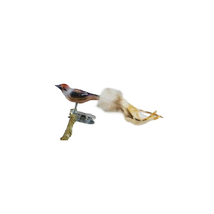 Stjärten består av äkta ljusbruna fjädrar som rör sig mjukt när fågeln placeras i granen eller i ett arrangemang. Den lätta fjäderstjärten ger figuren ett poetiskt och luftigt uttryck som passar fint både i moderna och traditionella juldekorationer.