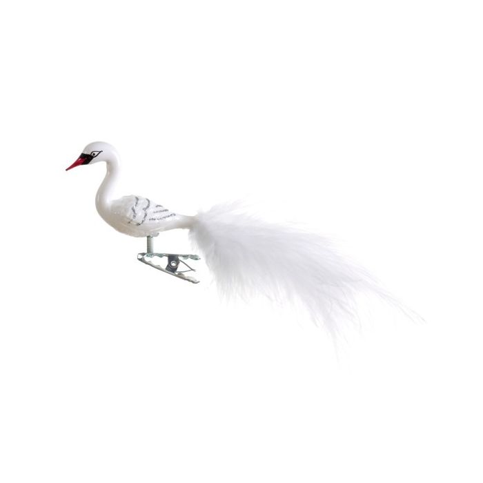 Klämman undertill gör det enkelt att placera svanen på grenar, i kransar eller i andra vinterliga dekorationer. En fin och genomarbetad glasfigur som förenar hantverk, ljushet och nordisk elegans.