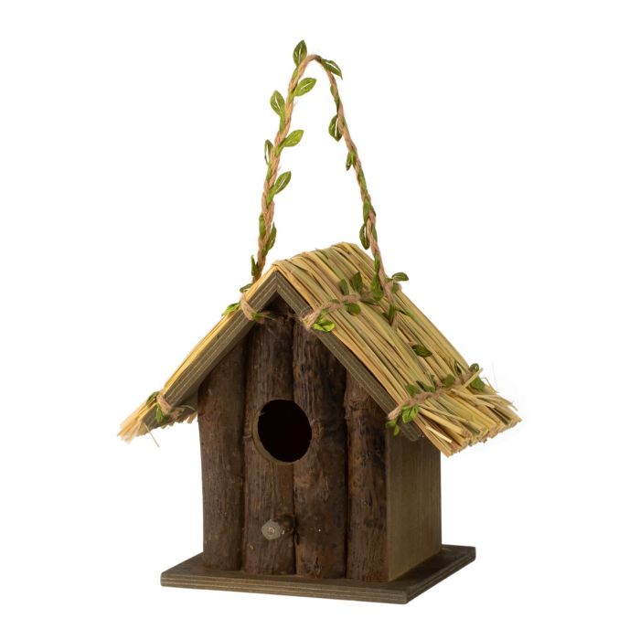 Mysig fågelholk för trädgårdens små fågelvänner. Fågelholken är gjord av trä med en liten pinne framför och ett hål för huset. Taket är också av trä med halm på. Ett snöre dekorerat med konstgjorda löv har monterats för upphängning.
