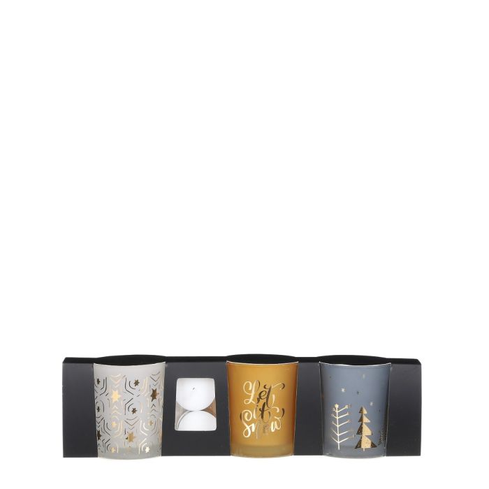 Värmeljushållare 3-pack i olika färger: vit, guld och blå alla med guldfärgad dekoration och jultema.
