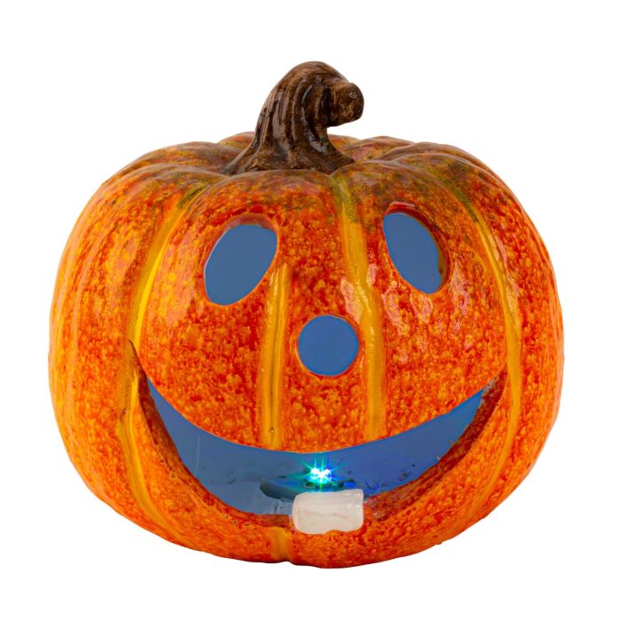 Pumpa med färgskiftande ljus. Pumpan har en riktig pumpastruktur på ytan och hål där det färgskiftande LED-ljuset verkligen kan lysa igenom.