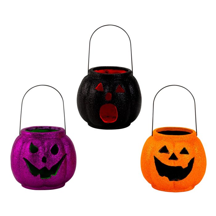 Pumpalykta med svart metallhandtag att hålla i handen eller hänga med. En värmeljus eller en liten ljuskedja kan placeras i pumpalyktan. Den kan också användas för att bära lite godis från turen hem.