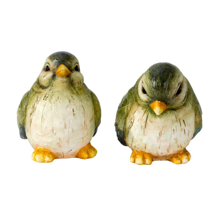 Fåglar för dekoration inne och ute (tål inte frost). Fåglarna har gröna vingar och finns i två varianter med huvudet i olika positioner. Kan till exempel stå i trädgårdskrukor eller dekorera fönsterbrädan.