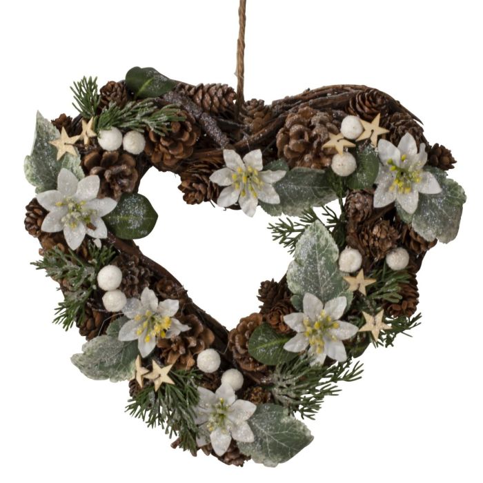 Hjärtformad pilkrans dekorerad med olika kottar, vita bär, små stjärnor och konstgjorda vita helleboreblommor. Kransen har ett lätt glitter. Jättefin som dörrdekoration eller liggande på ett bord, till exempel med ett stort blockljus i mitten.
