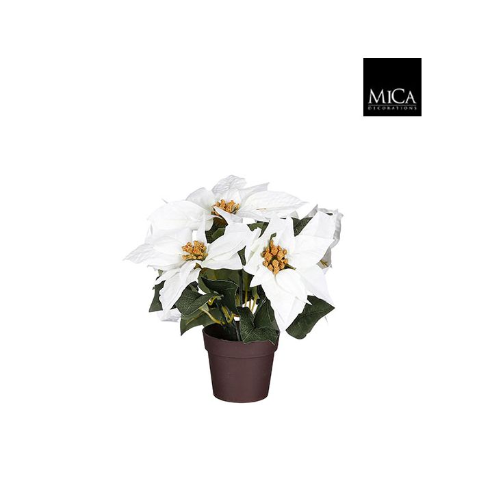 Vit julstjärna med många blommor och naturtrogna gröna blad. Julstjärnan är i en svart plastkruka. Mysigt på bordet eller till exempel i en korg med kottar och gran vid ytterdörren.