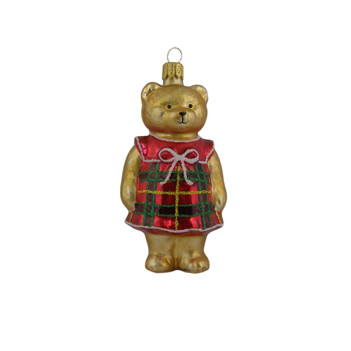 Detaljerad julgranskula föreställande mor teddybjörn iförd en fin, rutig klänning. Julgranskulan är munblåst och handmålad på det österrikiska glasblåseri Hanco. Figurkulor på grenar och julgranar är underbara blickfång bland de klassiska julkulorna.
