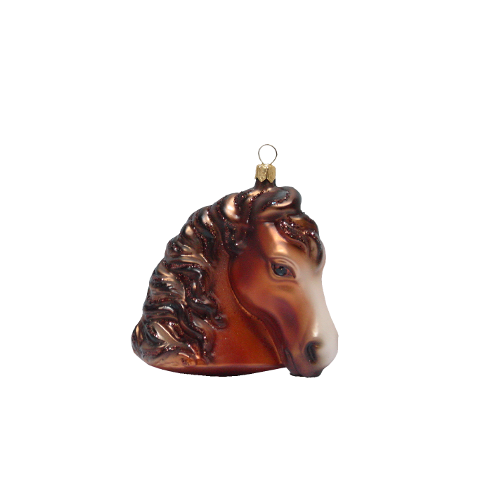 Detaljerad julkula föreställande ett hästhuvud med fina, mörkbruna nyanser. Julgranskulan är munblåst och handmålad på det österrikiska glasblåseri Hanco. Figurkulor på grenar och julgranar är underbara blickfång bland de klassiska julkulorna.