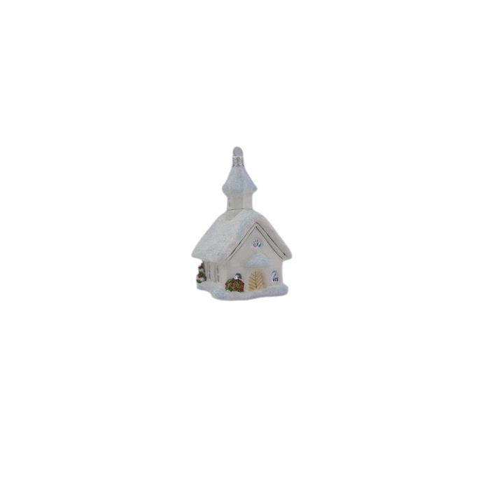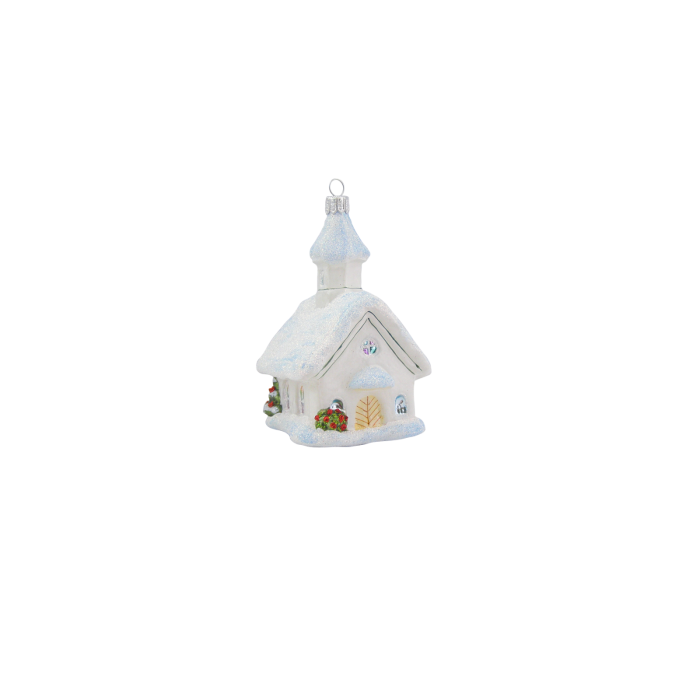 Detaljerad julkula föreställande en vacker, vit kyrka med snö på taket och på kyrktornet. Detaljerna på kyrkan är markerade med silver. Julgranskulan är munblåst och handmålad på det österrikiska glasblåseri Hanco. Figurkulor på grenar och julgranar är underbara blickfång bland de klassiska julkulorna.