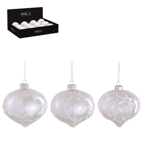 Matta, vita/elfenbensfärgade, lökformade julgranskulor med ett vitt blom- och lövmönster. Motivet på julgranskulorna varierar i tre olika utföranden. Julgranskulorna ser fina ut på till exempel granens gröna grenar eller liggandes som en vacker dekoration på bordet. De finns även i en klassisk, rund version.