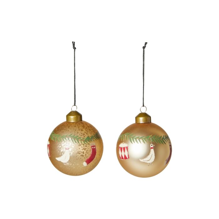 Klassiska julgranskulor med grangirlang och julmotiv som gås, trumma och julstrumpa. Julkulorna finns i matt guld och matt guld med sprucken yta. Väldigt fina på granen eller som bordsdekoration, där de matchar motiven från dukarna även från Speedtsberg. Julkulan finns även i rött.