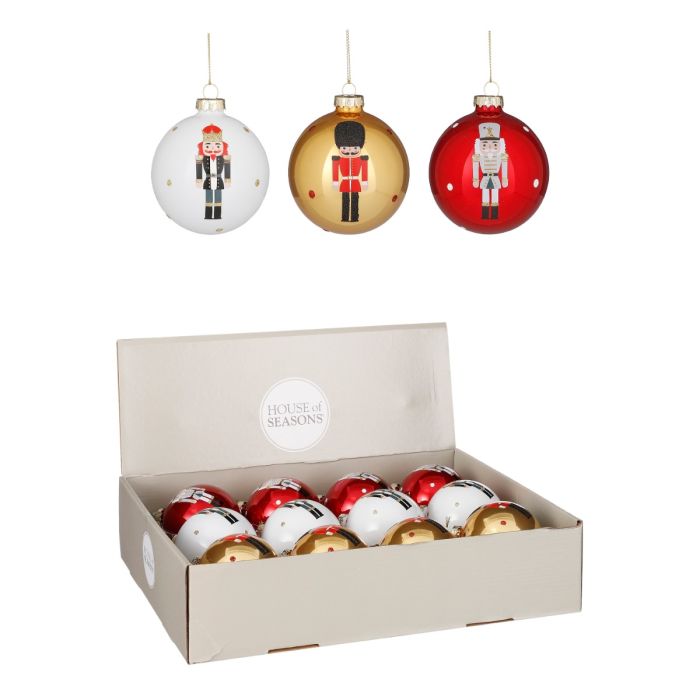 Enfärgade julgranskulor med prickar och motiv av en soldat från Nötknäpparen. Vackra och nostalgiska julgranskulor som dekoration på granen eller som dekoration på till exempel fat. Finns i 3 varianter.