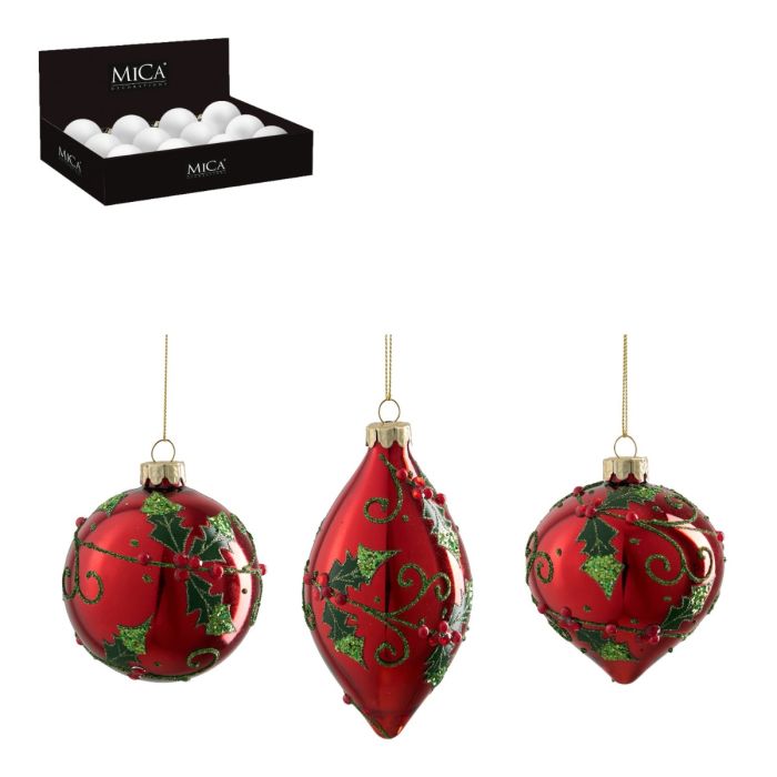 Julkulor i en röd nyans med ett elegant järneksmönster. Julkulorna finns i tre olika former: runda, lökformade och avlånga. De är gjorda av glas och ger julgranen ett klassiskt och stämningsfullt utseende. De kan användas ensamma eller kombineras med julklockan och julklappen från samma serie.