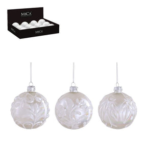 Matta, vita/elfenbensfärgade julgranskulor med ett vitt blom- och lövmönster. Motivet på julgranskulorna varierar i tre olika utföranden. Julgranskulorna ser fina ut på till exempel granens gröna grenar eller liggandes som en vacker dekoration på bordet. De finns även i en lökformad version.