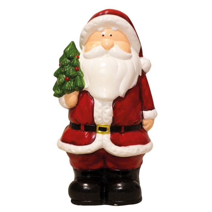 Den här stora jultomten på 44 cm sprider en varm och klassisk julkänsla med sin traditionella röda dräkt, sitt fylliga vita skägg och det gröna julträdet han håller i handen. De tydliga färgerna och den runda, charmiga formen gör figuren extra inbjudande för både barn och vuxna.
