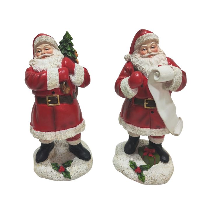Figurerna står på varsin snöflinga dekorerad med gröna järneksblad och röda bär, vilket ger en vacker och stämningsfull bas. Jultomtar finns i två varianter, välj mellan: Den ena tomten bär sin välfyllda gåvosäck över axeln tillsammans med en liten julgran – redo att dela ut glädje och överraskningar. Den andra håller sin långa önskelista, noggrant kontrollerande vilka barn som varit extra snälla i år.