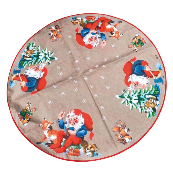 Fördjupa dig i julens sagovärld med denna stora och stämningsfulla julgransmatta illustrerad av Vilhelm Hansen. Här möts du av vänliga tomtar, nyfikna skogsdjur och små vinterdetaljer som tillsammans skapar en förtrollande scen under granens grenar. Motivet är fullt av liv och färger, precis som de klassiska illustrationer som gjort Hansen älskad i generationer. Mattan är tillverkad i mjuk polyester, och det röda kantbandet ger en vacker avslutning som framhäver hela det nostalgiska uttrycket. Med sina rymliga 135 centimeter i diameter passar den perfekt under större julgranar, där den blir en naturlig samlingsplats för klappar, pynt och julens alla små traditioner.