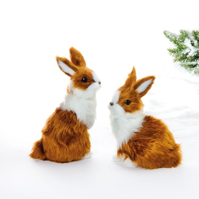 Söta och mjuka påskharar i brunt och vitt. Kaninerna har konstgjord päls och finns i sittande eller stående version. Påskhararna finns även i färgerna rosa och vitt.