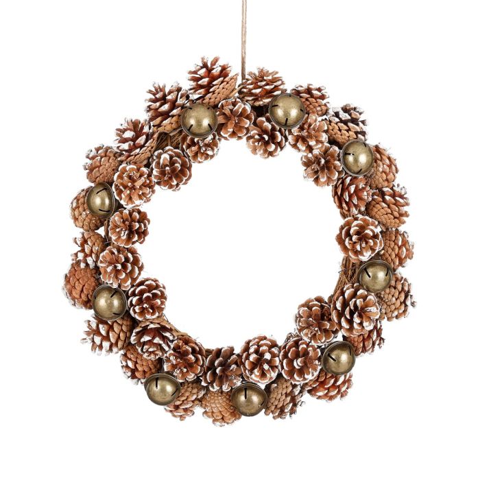 Naturlig krans med tallkottar med lite vit på som finns i olika storlekar. Kransen är tät med tallkottar och kan dekorera både till jul och vinter på dörrar, murar och liknande.