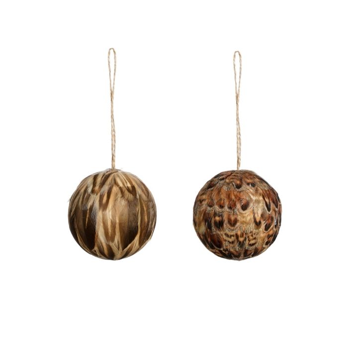 Kulformad dekoration i naturliga, bruna fjädrar med snöre för att hänga på grenar, i fönster eller på granen. Fjädrarna varierar i färg och mönster.