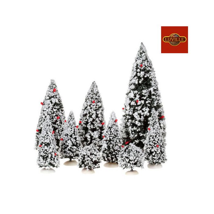 Luville Granar med snö och små, röda bär på. Det finns 9 granar i påsen. Träd ger en mysig atmosfär i jullandskapet.