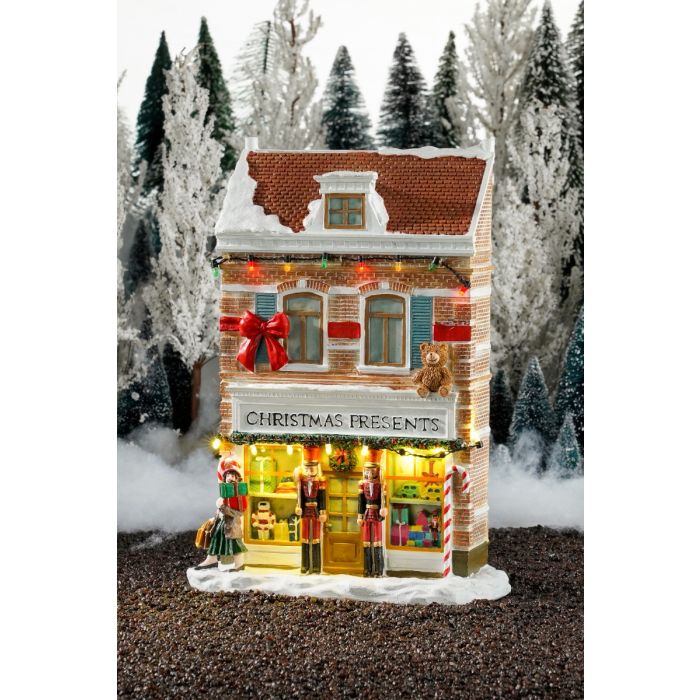 Förutom ortens leksaksbutik finns även julklappsbutiken som förutom leksaker även säljer alla möjliga andra presentidéer för vuxna och barn. Alla läckerheter är inslagna i finaste presentpapper, och rosetter knyts en efter en under den hektiska julsäsongen. Det är också en stor, röd rosett och brun nalle som fångade blickarna längst upp på fasaden. Två stora godisrör och soldater från Nötknäpparen ramar in de frestande skyltfönstren. Det är vitt ljus i julgirlangen och en färgad girlang på husväggen. En enkel kund har klarat alla julklappar och ger sig iväg i snön med famnen full av presenter. Julklappsbutiken är en del av Luvilles nyare serie av smala radhus.