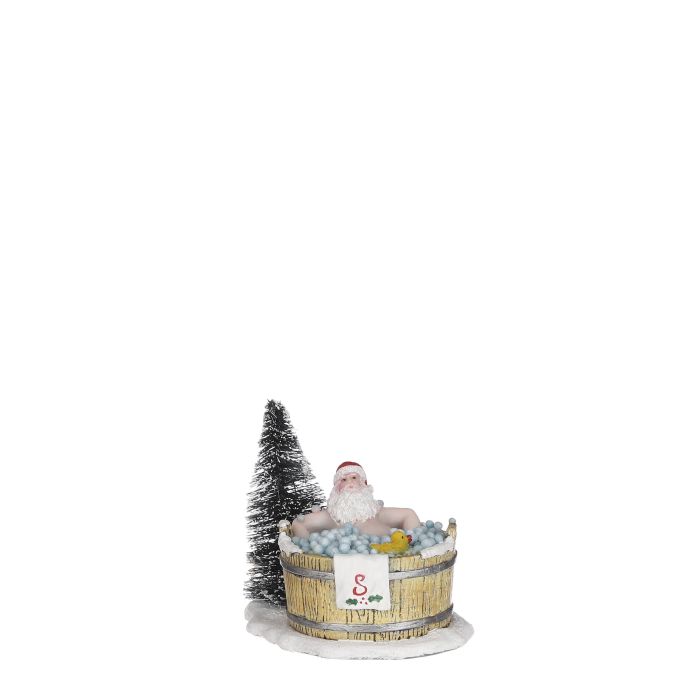 Jultomten tar en välförtjänt paus från julens hektiska tempo och sjunker ner i sitt varma bubbelbad, omgiven av mjuka snödrivor. Med skum runt sig, den röda tomteluvan på sned och en gul badanka som flyter bredvid, får figuren ett lekfullt och hjärtligt uttryck.