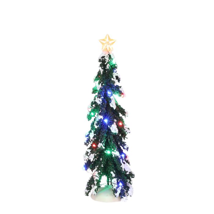 Luville Barrträd med flerfärgad belysning är ett stort fint träd med snö, flerfärgade LED-lampor och en stjärna med lampor ovanpå.