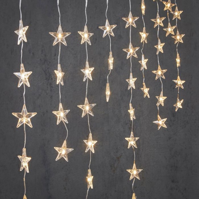 Ljusgardin med stjärnor med LED-ljus i klassiskt vitt. Ljusgardinen har timer, 8 ljusfunktioner och fjärrkontroll. Sätt ett ljus på vintermörkret framför fönstret eller lys upp väggen.