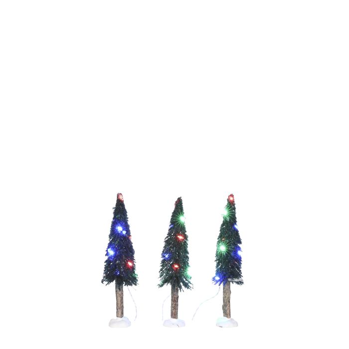 Detta är ett set som består av 3 stycken barrträd med ljus i olika färger.