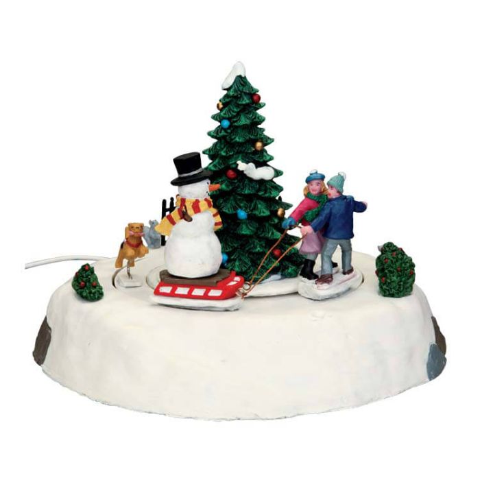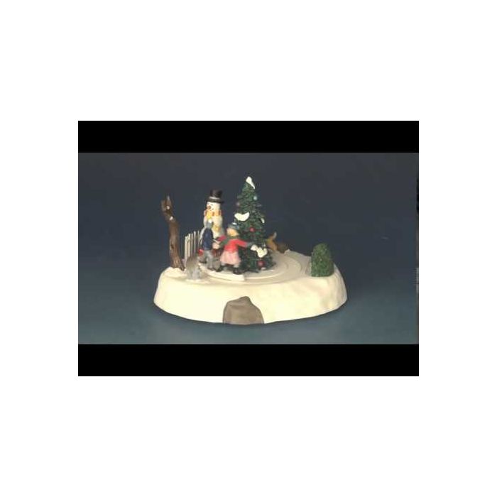 En i taget. Barn drar av sig snögubben på en släde runt granen, medan hunden springer efter. Figuren roterar.