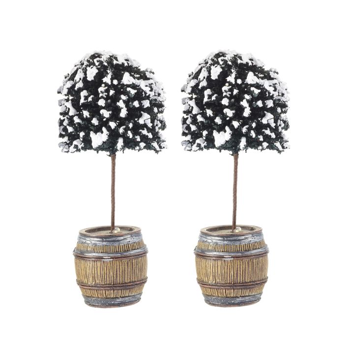 Stammade buxbomsväxter med snö som står i tunnor. Jättefin som dekoration i jullandskapet.