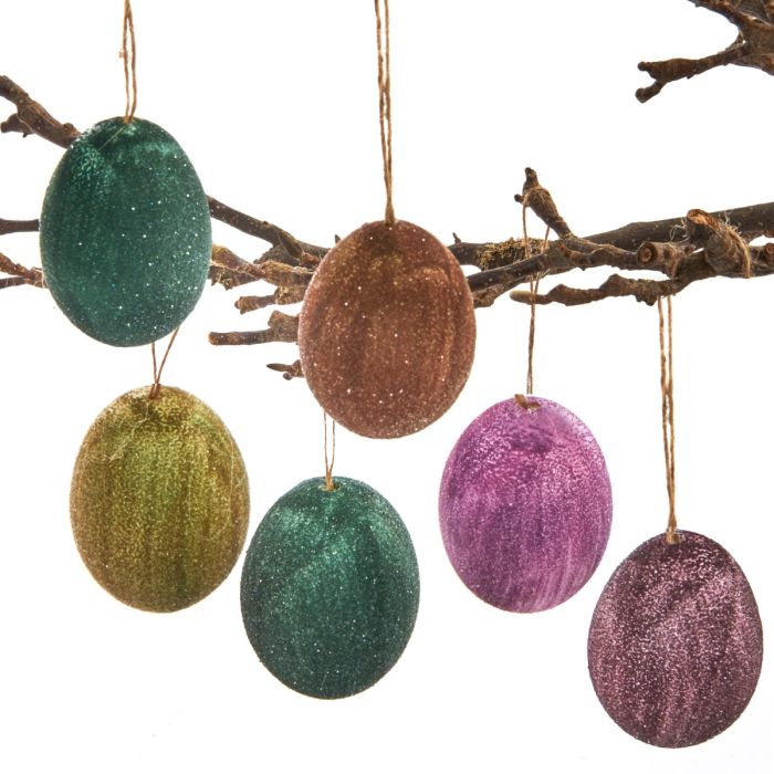 Påskägg med glitter i penseldrag och snöre för upphängning. Påskäggen finns i färgerna lila, grön eller gul. Det finns 6 ägg i en låda. Pryder vårens grenar så fint.