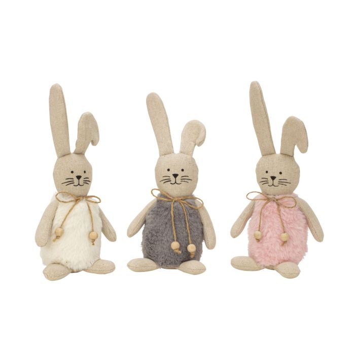 Påskhare i tyg med mjuk, plyschmage och rosett runt halsen. Påskharen finns i 3 färger: rosa, vit eller grå.