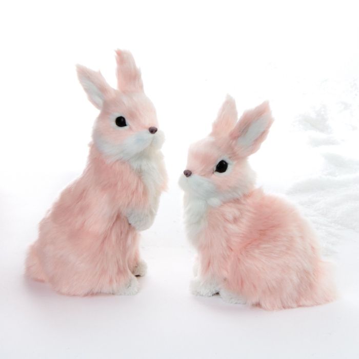 Söta och mjuka påskharar i rosa och vitt. Kaninerna har konstgjord päls och finns i sittande eller stående version. Påskhararna finns även i färgerna rosa och vitt.