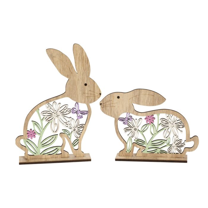 Påskhare i trä med snidade, färgade blommor och en fjäril i magen. Man blir i vårstämning! Påskhararna finns i två modeller och i två storlekar.